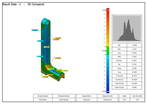 The usual deliverable to the client is in the form of a PDF report, including a 3D page where clients can view the deviation in an interactive 3D viewer. Deviation is calculated from a CAD nominal or previous base line scan data taken from a known in spec part. For smaller parts, we can use a range of 3D scanners providing suitable scans for the application of inspection. For larger parts that cannot be moved, such a tooling, jigs or large installations, we use portable solutions to inspect in situ.